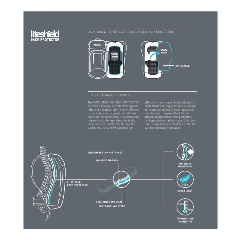 - Protection dorsale LiteShield avec absorption des chocs Ă 95 %.